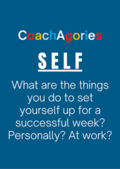 So, my team created meeting starter cards which we call CoachAgories, that offer questions in three categories: Work, Self & Life (based on the model from Your Oxygen Mask First). Here are some examples: