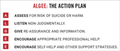 2. Mental Health First Aid (MHFA). Using the ALGEE model (Assess, Listen, Give reassurance and information, Encourage appropriate professional help, and Empower with self-help strategies) MHFA provides practical, step-by-step guidance about what to do if you or someone else are having a mental health crisis. Learn more about ALGEE in action here and how to talk to your team about burnout here.